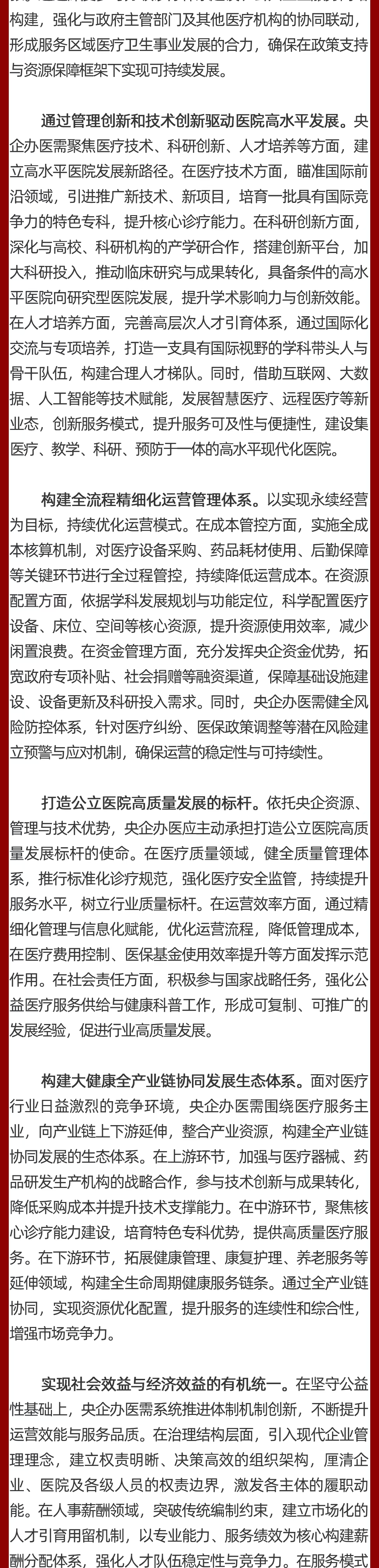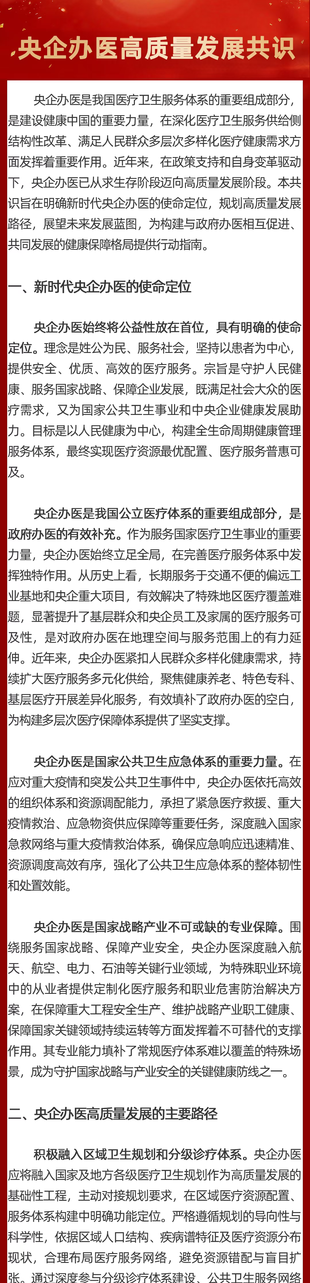 現(xiàn)將《共識》全文發(fā)布如下,期待與各方攜手,共同推動央企辦醫(yī)高質(zhì)量發(fā)展,為增進(jìn)人民健康福祉貢獻(xiàn)更大力量!